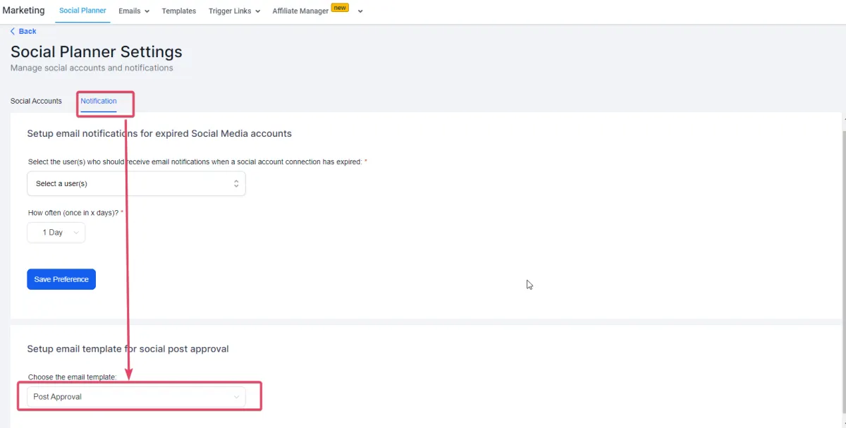 Wählen Sie die E-Mail-Vorlage unter E-Mail-Vorlage für die Genehmigung von Social Posts einrichten