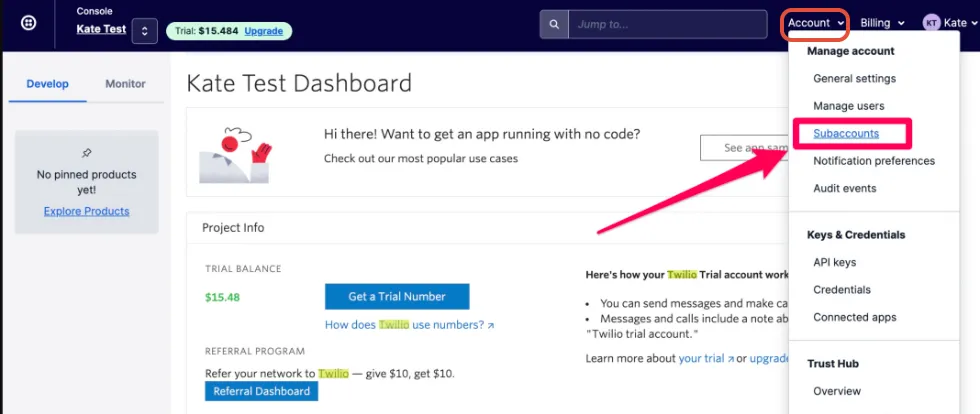 1. Gehen Sie zum Konto-Dropdown-Menü oben rechts, klicken Sie auf Unterkontenhttps://console.twilio.com/