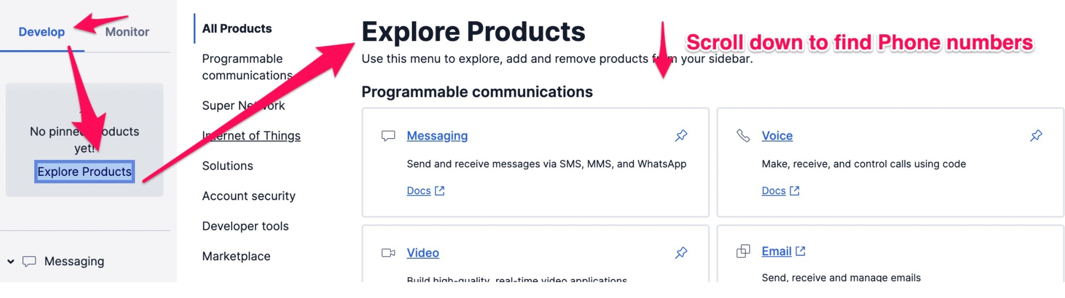 Gehe zu Produkte erkunden -> Scrolle nach unten, um auf Telefonnummern zu klicken