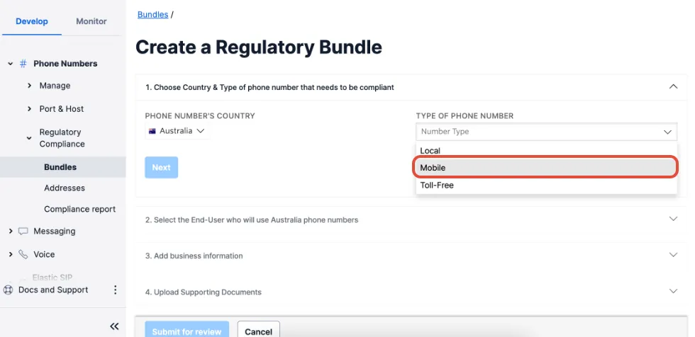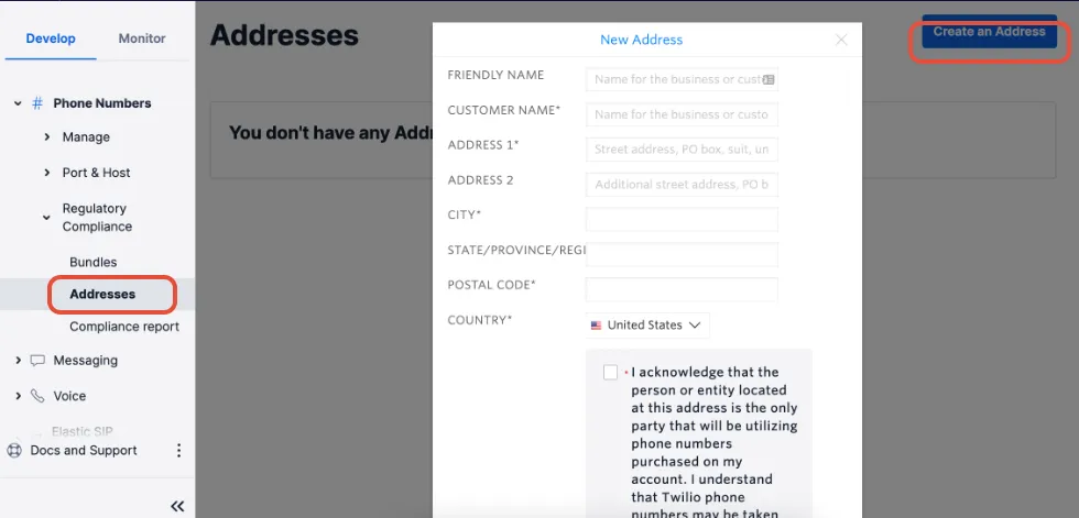 Twilio-Nummer kaufen - "Bitte wählen Sie ein Bundle/eine Adresse aus, um die Nummer zu erwerben."