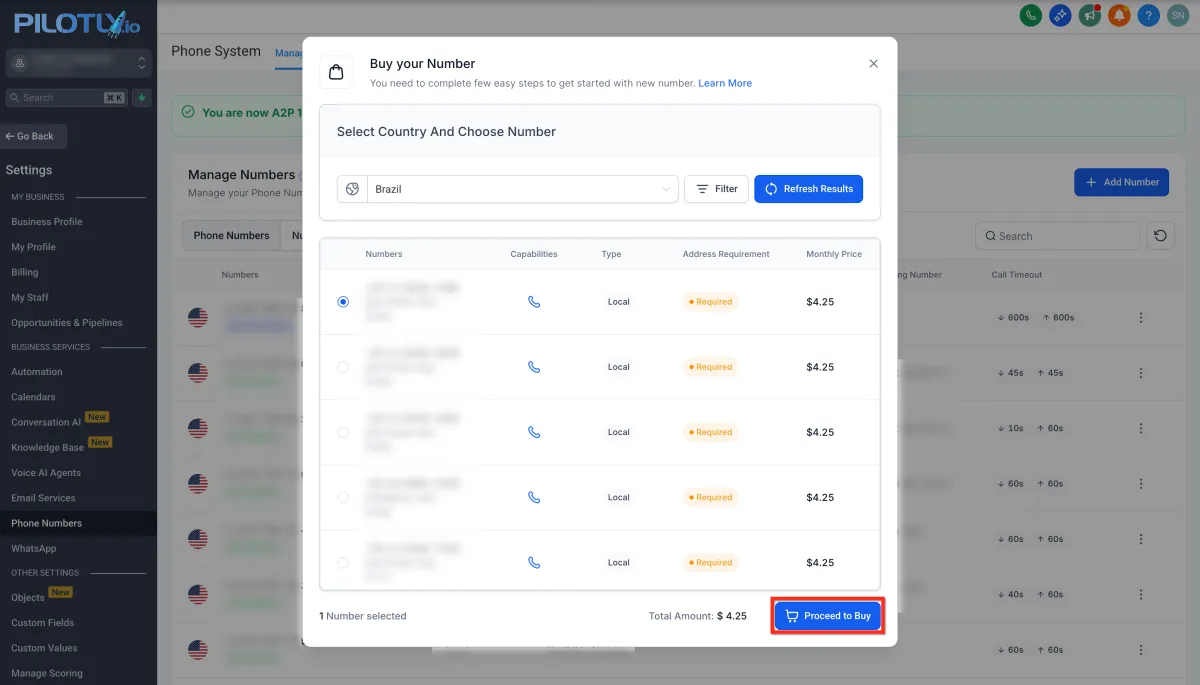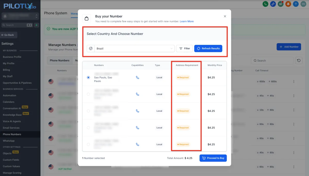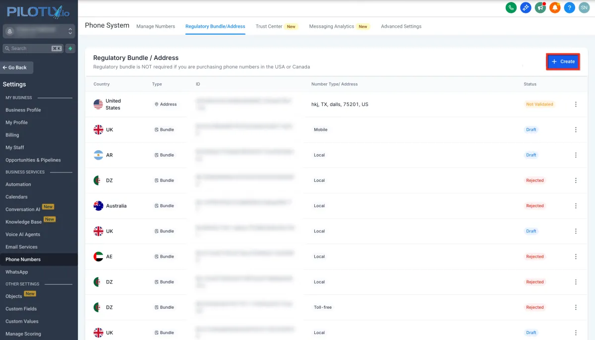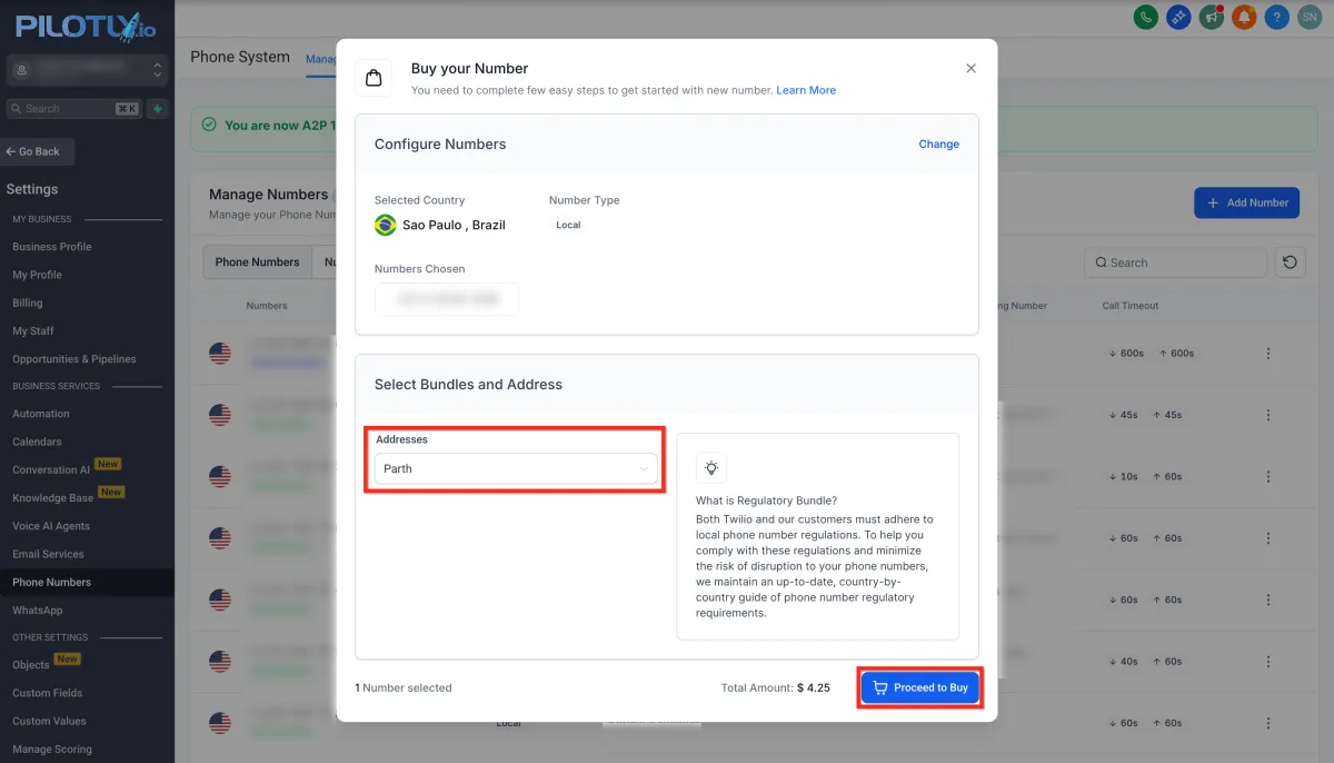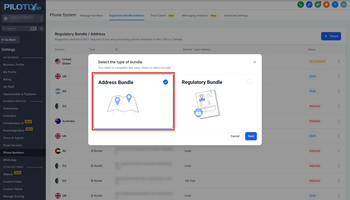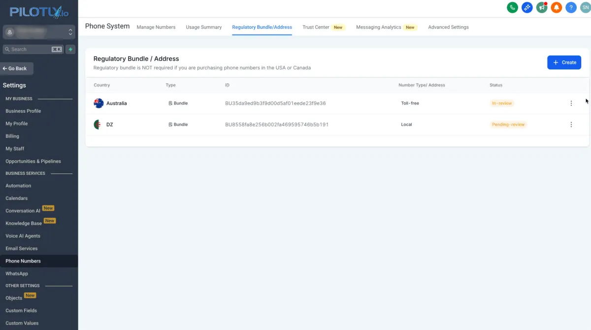 Ohne ein Regulierungspaket können Telefonnummern in regulierten Regionen nicht aktiviert werden. LC Phone-Nutzer können diesen Vorgang direkt über die pilotly.io-Plattform verwalten.