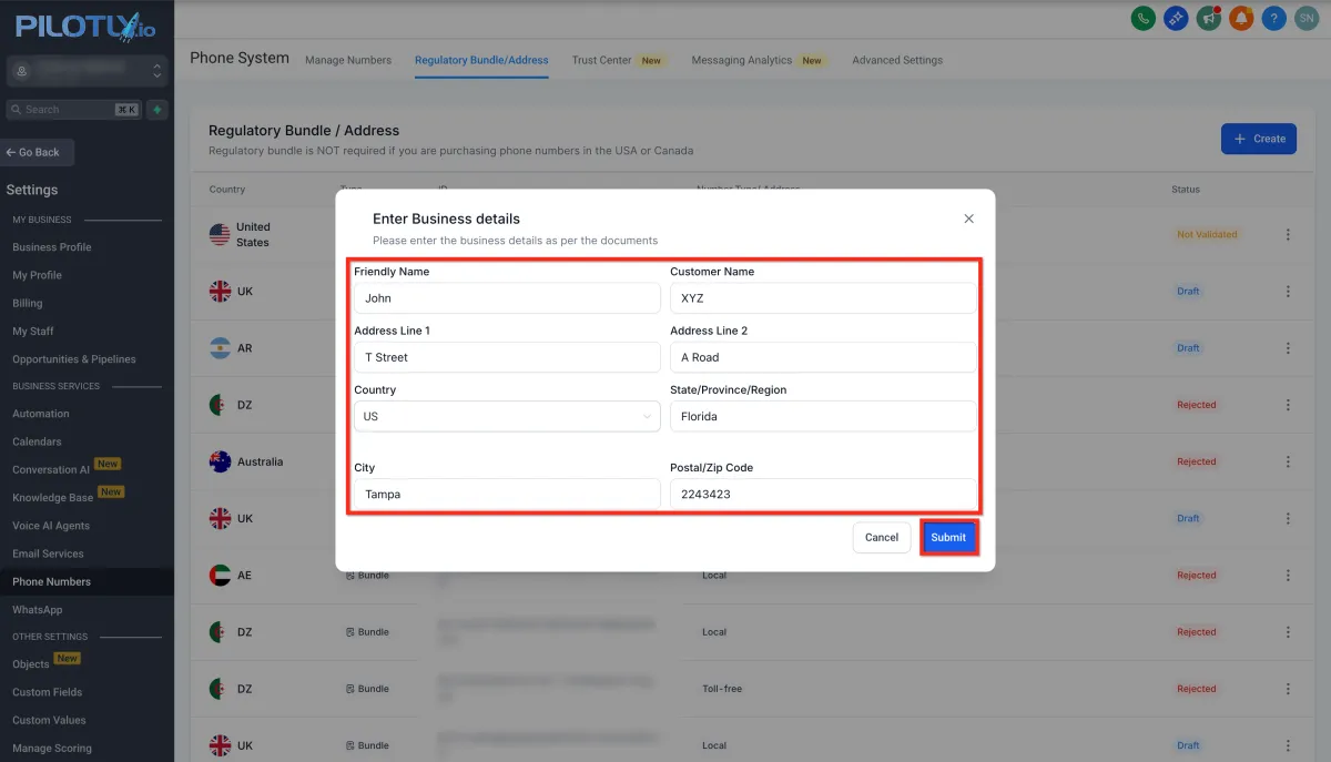 Erfahren Sie, wie Sie in pilotly.io mit LC Phone ein regulatorisches Paket und Adressen für Unterkonten erstellen. Dies gewährleistet die Einhaltung der Telekommunikationsvorschriften, sodass Sie Telefonnummern in regulierten Ländern erfolgreich erwerben können.