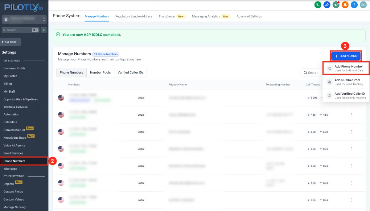 LC Phone-Nutzer können regulatorische Pakete direkt in pilotly.io über die integrierte Registerkarte „Compliance“ in jedem Unterkonto erstellen und verwalten.