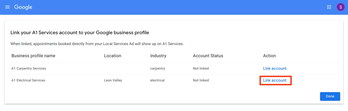 6. Melden Sie sich an und verknüpfen Sie Ihr Google Local Services Ads-Konto (öffnet sich in einem neuen Tab). Kontaktieren Sie den Support, wenn Sie nicht denselben Bildschirm wie unten sehen können.