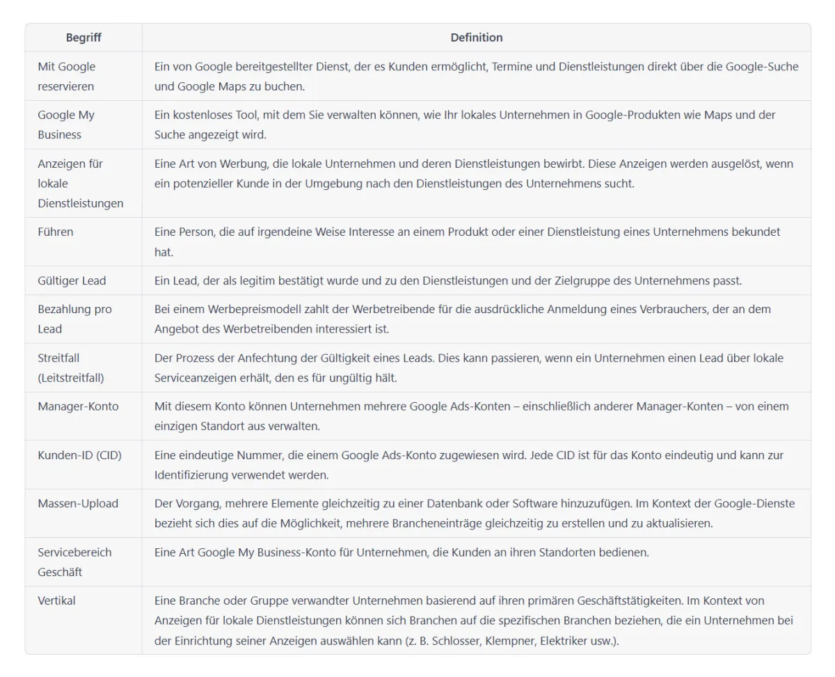 Local Services Ads ist ein Google-Werbungsdienst, der Dienstleistungsunternehmen (wie Klempner, Elektriker usw.) dabei unterstützt, ihre Dienstleistungen auf Google zu bewerben. Wenn potenzielle Kunden auf Google nach einer bestimmten Dienstleistung suchen, erscheinen Anzeigen von lokalen Dienstleistungsanbietern oben in den Suchergebnissen.