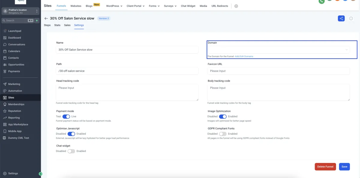2. Gehen Sie zu den Trichtereinstellungen (die Sie in WordPress verwenden möchten). Konfigurieren Sie die Domain und speichern Sie sie.