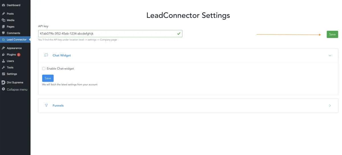 1. Gehen Sie zu Ihren LeadConnector WP-Einstellungen und aktualisieren Sie die Seite hart, falls sie bereits geöffnet ist. Klicken Sie auf den API-Schlüssel Speichern-Button.