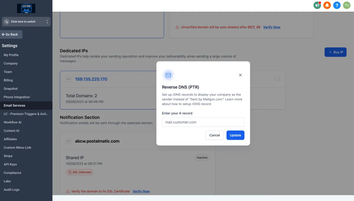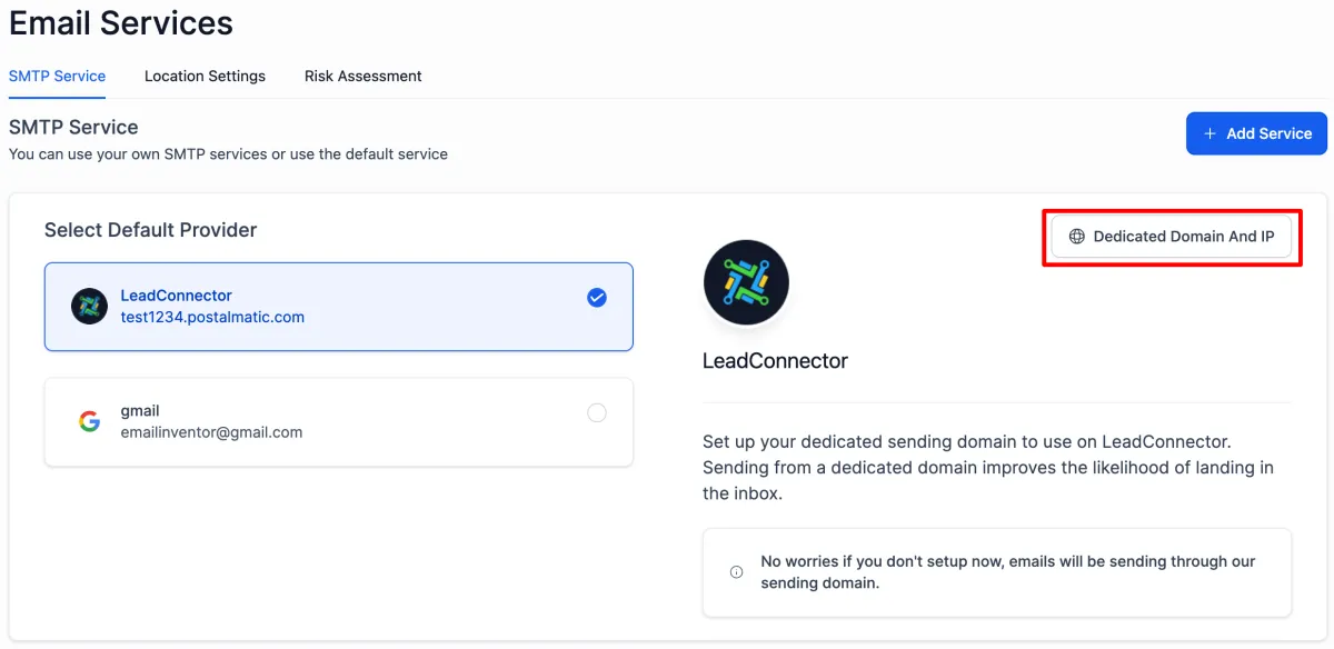 Im SMTP-Dienst-Tab klicken Sie auf den dedizierten Domain- und IP-Bereich im LeadConnector-Abschnitt.
