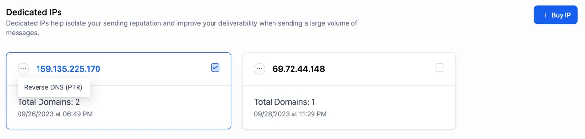 Gehen Sie zum Abschnitt für dedizierte IP und klicken Sie auf die drei Punkte bei dedizierter IP und dann auf Reverse DNS (PTR).