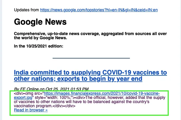 Der RSS-E-Mail-Inhalt zeigt HTML-Tags wie diesen <p>