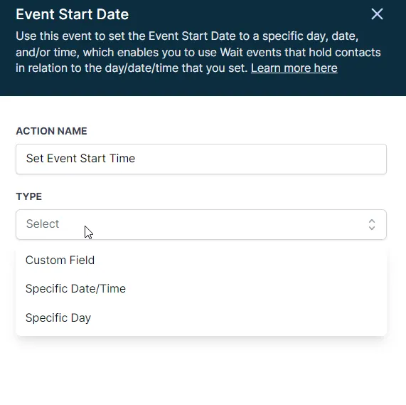 Sie haben normalerweise Optionen für den Typ wie Benutzerdefiniertes Feld, Spezifisches Datum/Uhrzeit oder Spezifischer Tag.