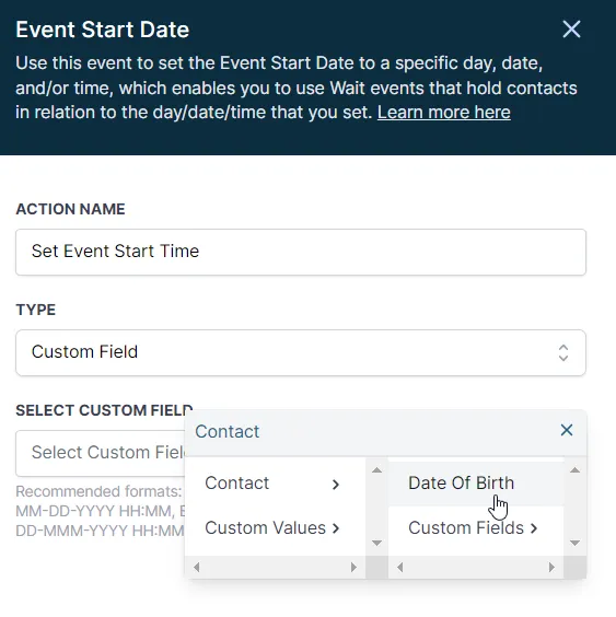 Für benutzerdefinierte Felder können Sie vorab erstellte benutzerdefinierte Datumsfeldwerte verwenden, um dem Workflow mitzuteilen, welches Ereignisdatum Sie angeben möchten.