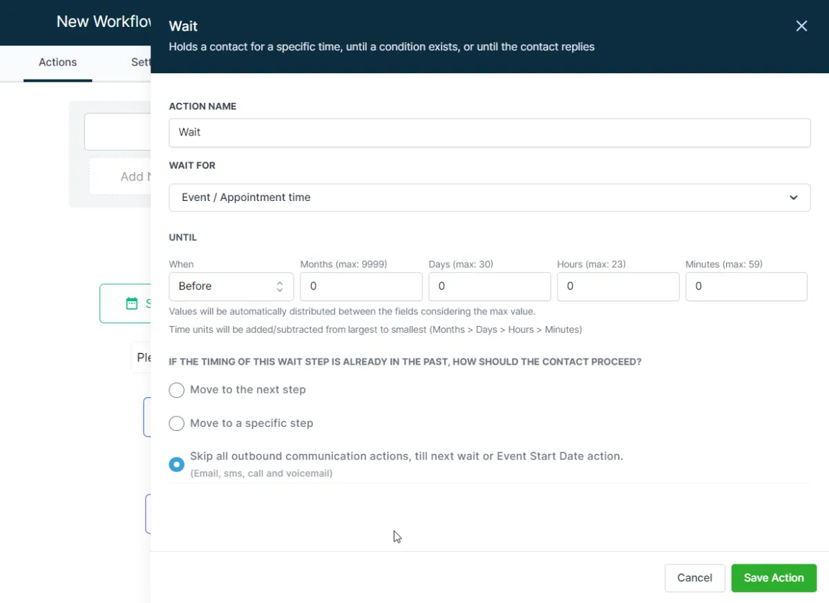 Die Aktion "Warten auf Ereignis-/Terminzeit" hat einige weitere Konfigurationen. Ereignis-/Terminzeit: Dieses Feld bezieht sich typischerweise auf das Ereignis oder den Termin, den Sie mit der Aktion "Ereignisstartdatum/-zeit festlegen" gesetzt haben. Die Aktion "Warten auf" wird so lange angehalten, bis die angegebene Zeit in Bezug auf dieses Ereignis oder den Termin erreicht ist. BIS - Wann: Diese Konfiguration ermöglicht es Ihnen, die Wartezeit bis zur nächsten Aktion einzustellen. Dies basiert auf einem Zeitraum von Monaten, Tagen, Stunden und Minuten. Zum Beispiel könnten Sie dies so einstellen, dass bis 2 Tage und 3 Stunden vor der Ereigniszeit gewartet wird. Werte, die das Maximal-Limit überschreiten, werden auf die größeren Zeiteinheiten verteilt. Wenn Sie zum Beispiel 60 Minuten eingeben, wird dies in 1 Stunde umgewandelt. WENN DER ZEITPUNKT DIESER WARTEPHASE BEREITS IN DER VERGANGENHEIT LIEGT, WIE SOLL DER KONTAKT FORTFAHREN?: Diese Konfiguration bestimmt, wie das System Fälle behandelt, in denen die Wartezeit bereits abgelaufen ist. Die Optionen umfassen typischerweise: Zum nächsten Schritt wechseln: Der Workflow wird das Warten überspringen und zum nächsten Schritt im Workflow übergehen. Zu einem bestimmten Schritt wechseln: Der Workflow wird das Warten überspringen und zu einem spezifischen Schritt übergehen, den Sie festlegen. Alle ausgehenden Kommunikationsaktionen überspringen, bis zum nächsten Warten oder Ereignisstartdatum-Aktion: Der Workflow wird alle Aktionen, die das Senden von Kommunikation (wie E-Mails oder SMS) beinhalten, überspringen, bis er auf die nächste "Warten auf Ereignis-/Terminzeit" oder "Ereignisstartdatum/-zeit festlegen" Aktion trifft.