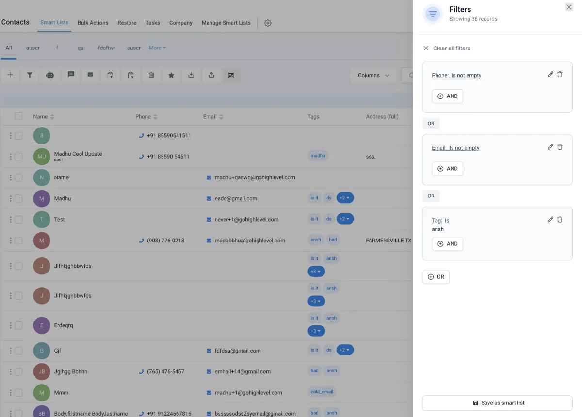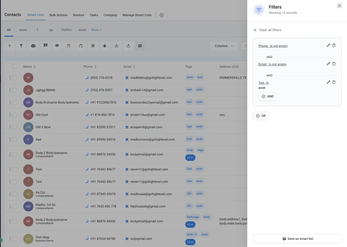 Jede UND-Bedingung muss für jeden Kontakt erfüllt sein, der in dieser Smart List verfügbar ist.Beispiel: Kontakte mit einem bestimmten Tag, die sowohl eine E-Mail-Adresse ALS AUCH eine Telefonnummer haben.