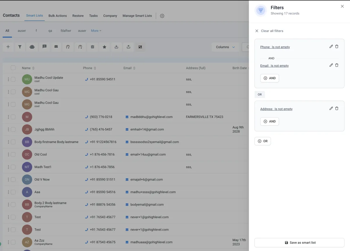 Gruppen von UND-Filtern können mit der ODER-Bedingung zwischen ihnen für eine höhere Anpassung bei der Filterung verwendet werden.Beispiel: Kontakt mit sowohl einer E-Mail UND Telefon ODER nur einer Adresse.