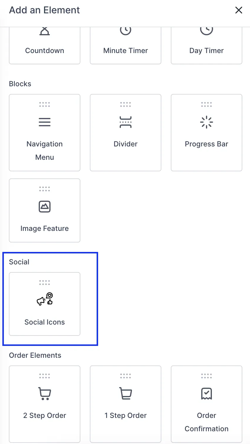 Soziale Medien Symbole fallen unter Elemente in der Kategorie Soziales. Ziehen Sie das Element einfach per Drag-and-Drop in den Builder.