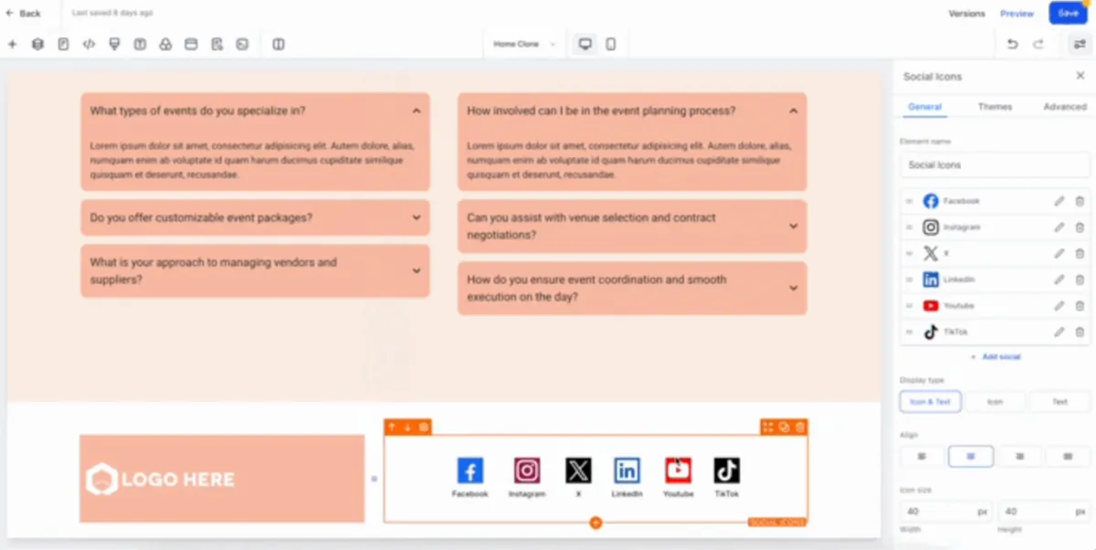 Sie müssen keinen benutzerdefinierten Code mehr schreiben oder Zeit mit der Erstellung von Social Bars verbringen. Diese Funktion bietet Unterstützung für beliebte Social-Media-Icons, einschließlich Facebook, Instagram, LinkedIn, YouTube, TikTok und mehr. Sie können aus verschiedenen Themen für ihre Social Bar wählen, was die Konfiguration von Responsivität und Design erleichtert.
