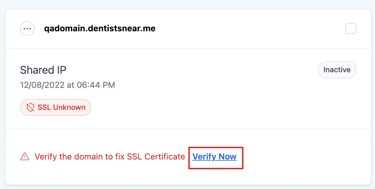 Überprüfen Sie die Domäne erneut, indem Sie die Schritte zur Domänenüberprüfung ausführen. Dadurch wird das System aufgefordert, ein neues SSL-Zertifikat zu generieren, falls es nicht ausgestellt wurde oder während des Vorgangs ein Fehler aufgetreten ist.