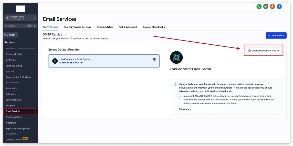 Navigieren Sie zu Einstellungen > E-Mail-Dienste > Dedizierte Domäne und IP .