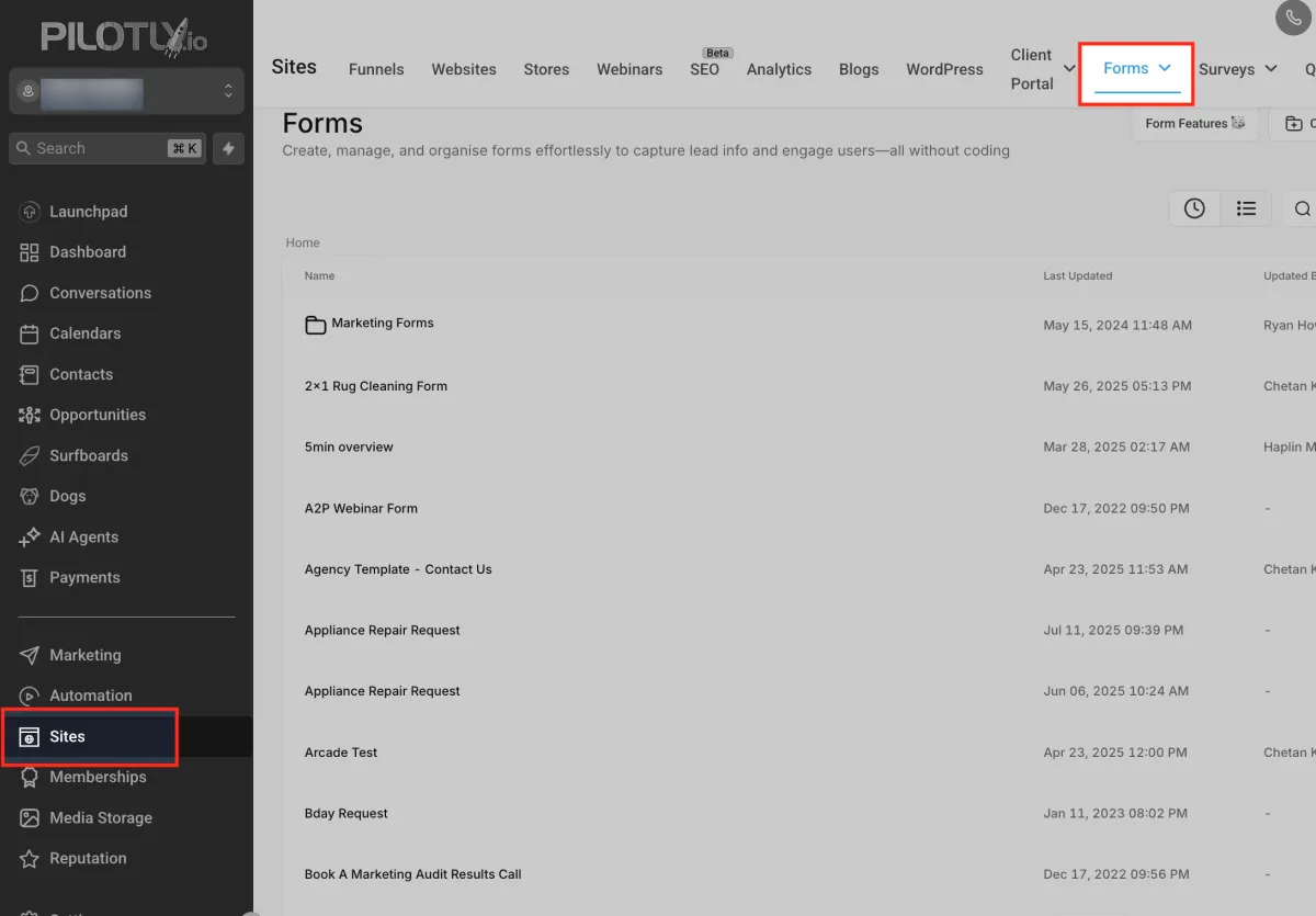 Navigieren Sie zu Sites > Forms, dann öffnen Sie den Form Builder.