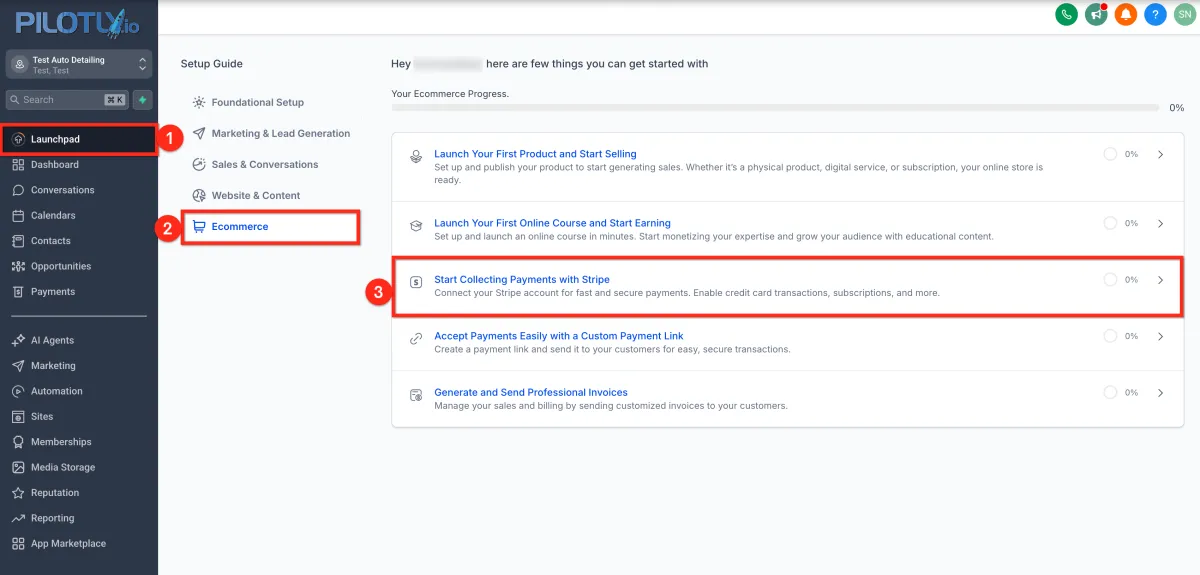 Klicken Sie auf die Option „Zahlungseinzug mit Stripe starten“ .