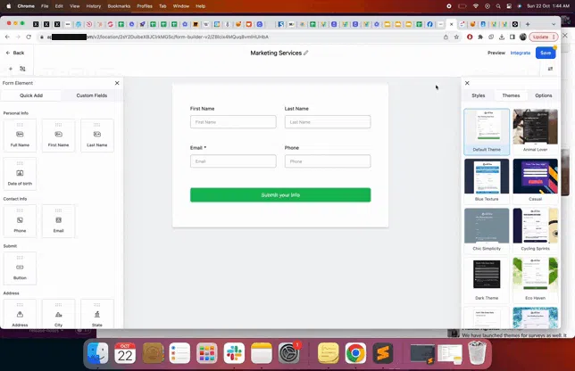 Themen im neuen Formular- und Umfrage-Builder bieten umfangreiche Anpassungsoptionen und ermöglichen es Ihnen, aus einer Vielzahl professionell gestalteter Themen auszuwählen, die zu Ihrer Markenidentität passen. Mit benutzerfreundlichen Steuerelementen und Echtzeit Vorschauen können Sie ganz einfach visuell ansprechende und reaktionsschnelle Formulare erstellen. Diese Themen vereinfachen den Designprozess, sparen Zeit und gewährleisten ein konsistentes und professionelles Erscheinungsbild über mehrere Formulare hinweg. Regelmäßige Aktualisierungen der Themenbibliothek halten Ihre Formulare auf dem neuesten Stand der Ästhetik.