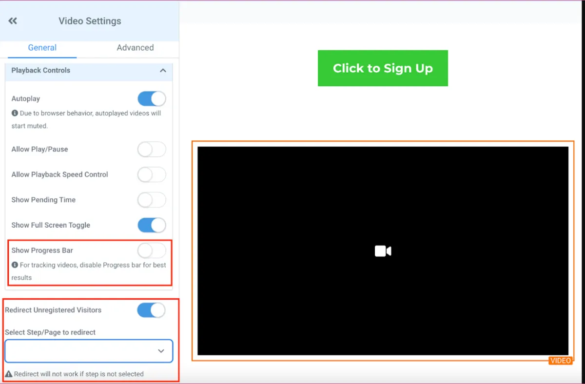 in den Videoelement-Einstellungen zu deaktivieren , damit Zuschauer nicht in einem Video vor- und zurückspringen können und eine genaue Fortschrittsverfolgung gewährleistet ist. 3. Es wird außerdem empfohlen, eine Weiterleitung für nicht registrierte Besucher einzurichten .