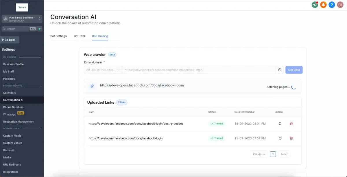 Gehen Sie zu "Bot Training" in den Einstellungen des Conversation AI Bots.