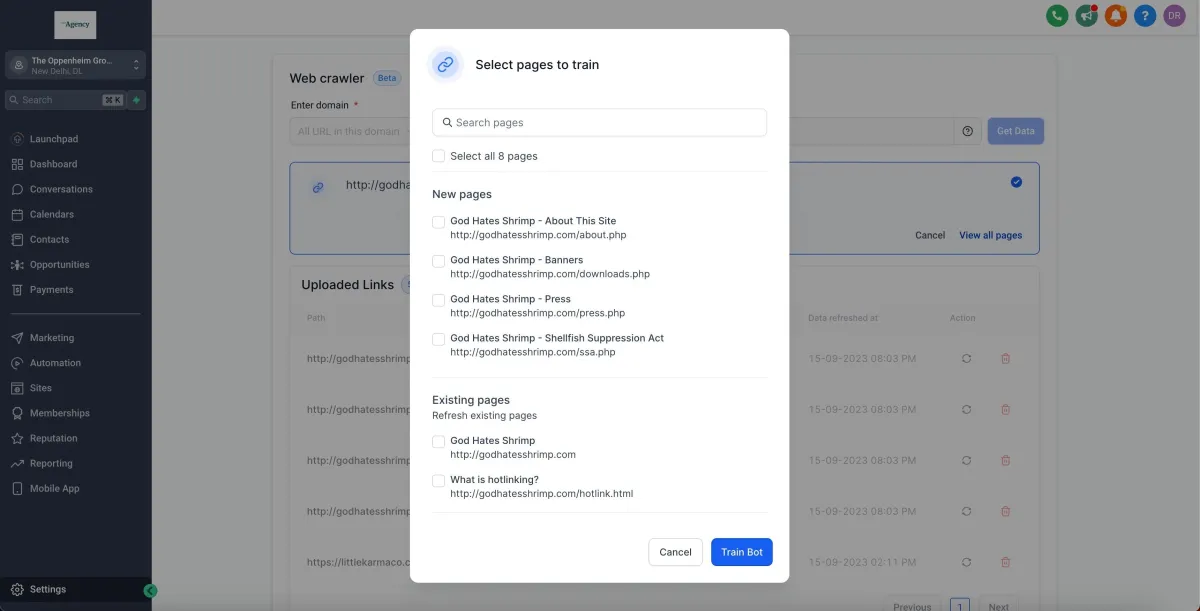 Wählen Sie die Seiten aus, die für das Training des Bots relevant sein werden, und klicken Sie auf "Bot trainieren."
