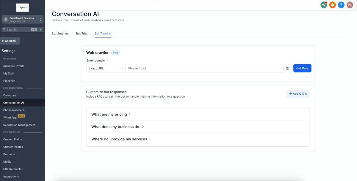 Der Bot kann trainiert werden, indem URLs zu Webseiten und Blogs (ja, im Plural) bereitgestellt werden, um dem Bot zu helfen, Ihr Unternehmen zu verstehen und effektiv auf Ihre Kontakte zu reagieren.