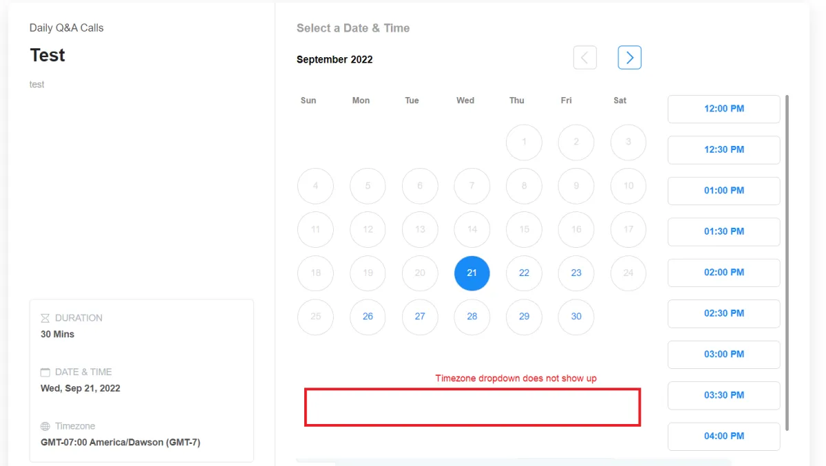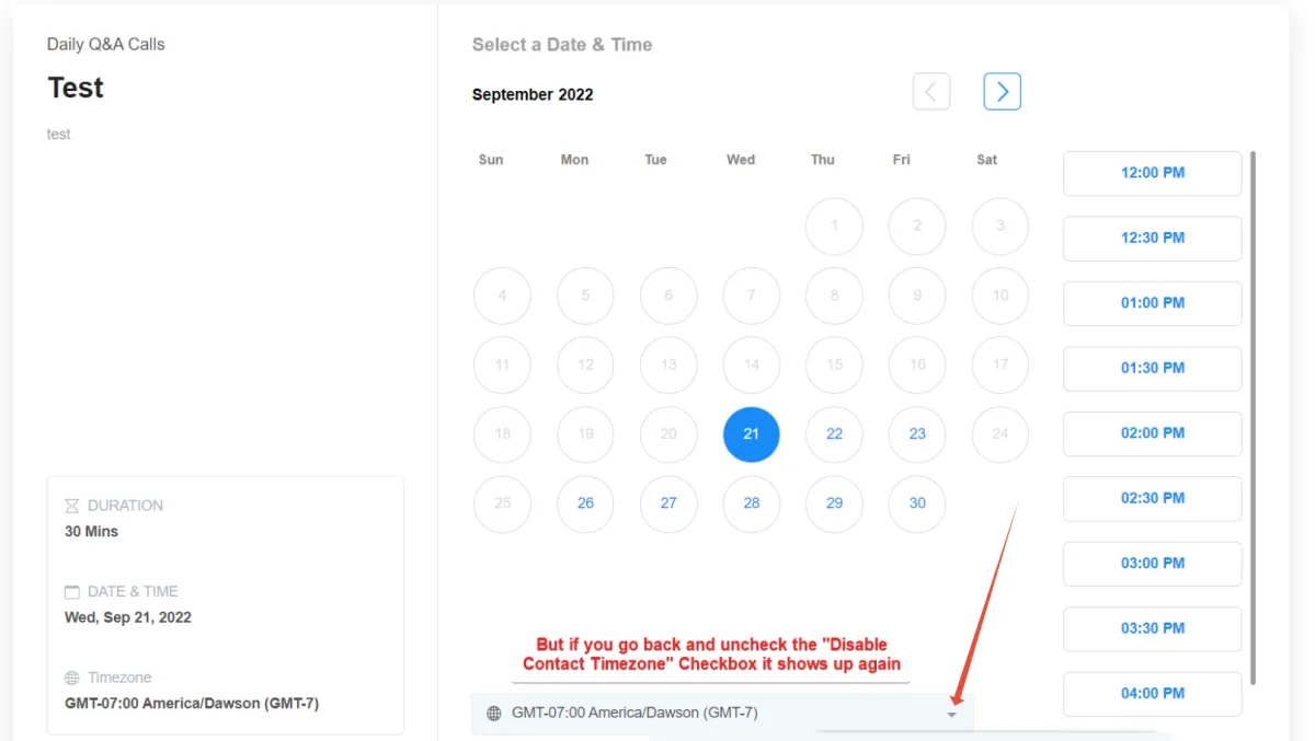 Mit der "Deaktivieren Sie die Kontaktzeit Zone" Wenn das Kästchen ausgewählt ist, sehen Benutzer den Zeitzonen-Dropdown-Selektor im Kalender-Widget nicht mehr (siehe untenstehenden Screenshot), und alle Termine werden in der Zeitzone gemacht, die in den Standorteinstellungen festgelegt ist.