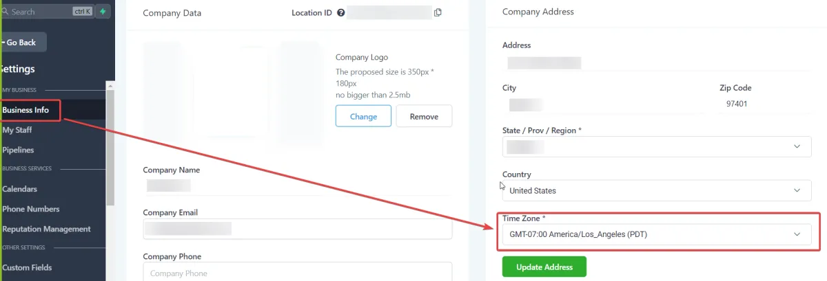 Um zu sehen, welche Zeitzone für den Standort festgelegt ist, gehen Sie bitte in die Standorteinstellungen > Geschäftsinformationen > Feld Zeitzone.