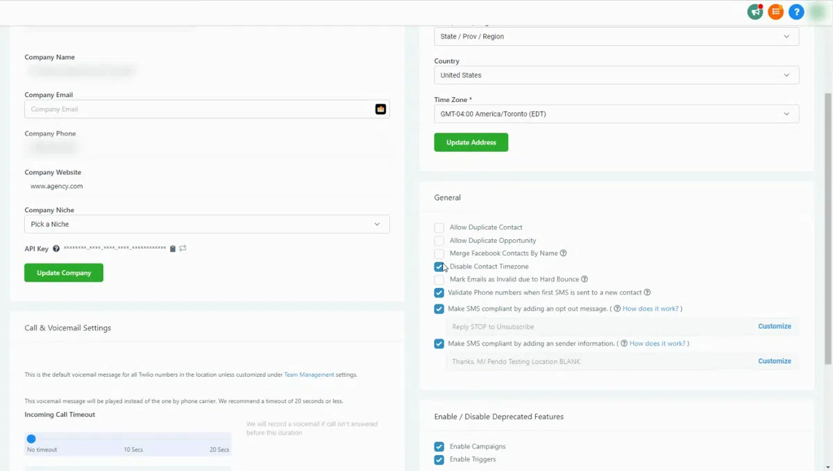 Einstellungen > Registerkarte "Geschäftsinformationen" auswählen > Nach unten scrollen und das Kontrollkästchen "Kontaktzeitzone deaktivieren" aktivieren.