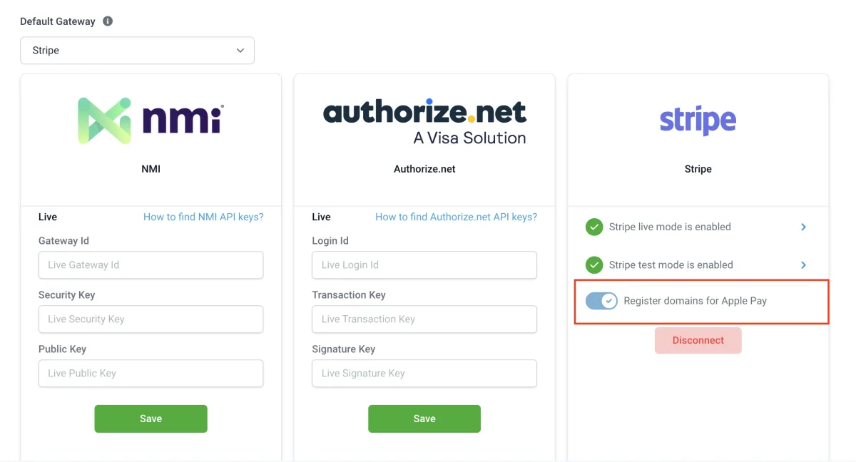 Die Hauptvoraussetzung ist die Verwendung von Stripe Connect auf der Seite Zahlungen ➝ Integrationen. Wenn Sie Stripe APIs verwenden, um sich mit Stripe zu verbinden, nutzen Sie bitte Stripe Connect, um diese Funktion zu verwenden. Sobald Sie Ihr Stripe-Konto unter Zahlungen> Integrationen verbunden haben, wird ein Umschalter bereitgestellt, um Apple Pay und Google Pay in den Bestellformularen zu aktivieren.