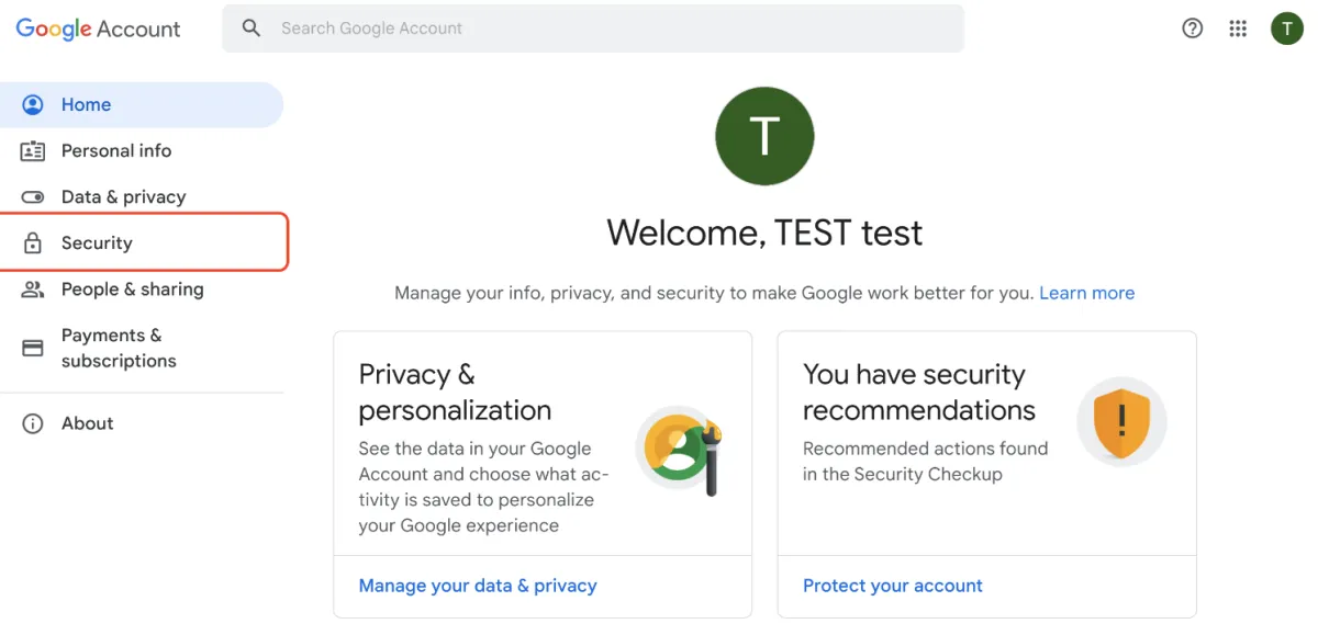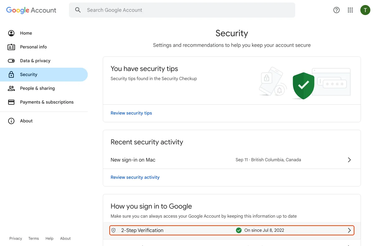 Aktualisieren Sie die Seite „Google-Konto verwalten“, um zu sehen, ob die Bestätigung in zwei Schritten jetzt angezeigt wird:
