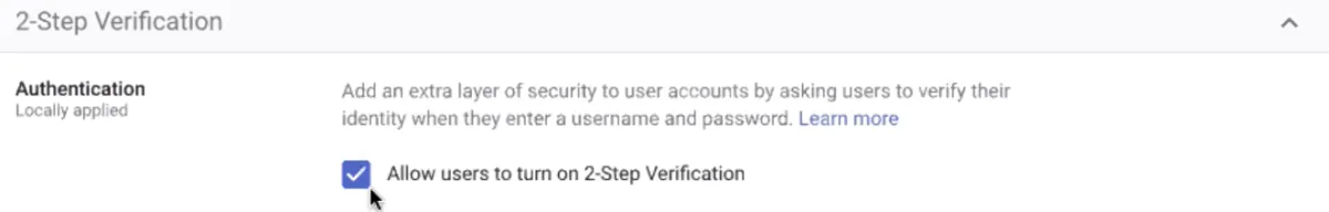 Wenn die Bestätigung in zwei Schritten fehlt, ist die Option zur Aktivierung der Bestätigung in zwei Schritten in Google Admin deaktiviert. Wenden Sie sich an den Google Workspace-Administrator, um die Option gemäß diesem Artikel zu aktivieren.