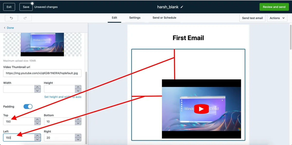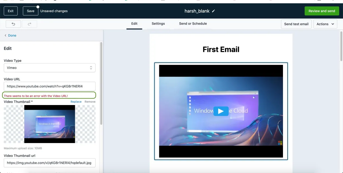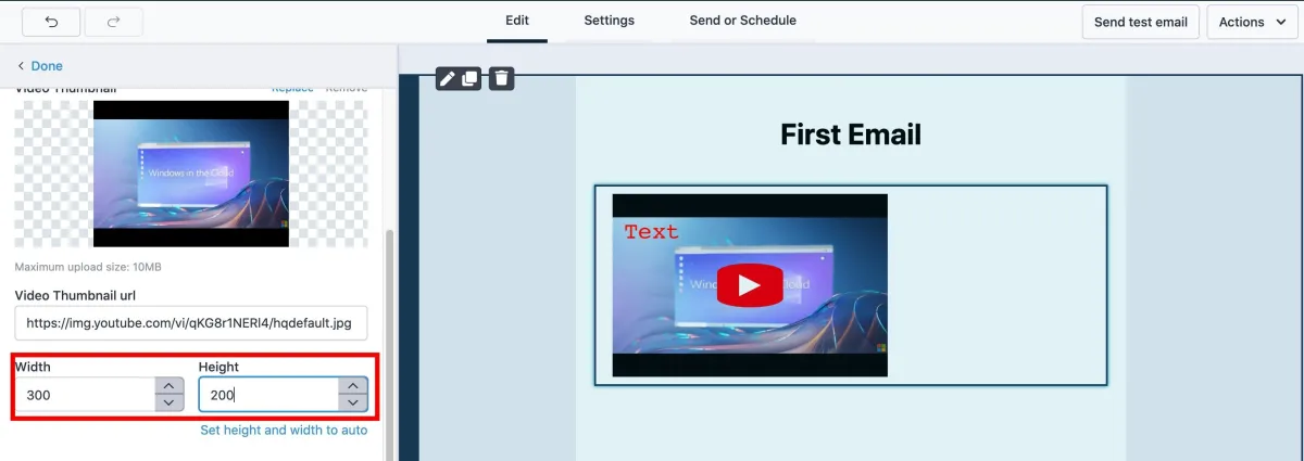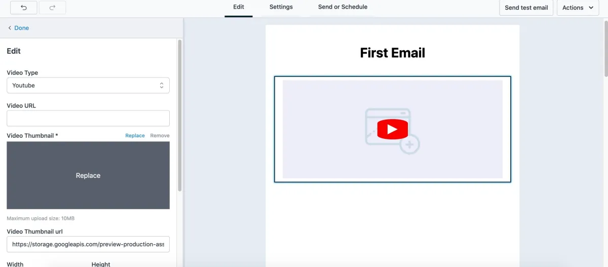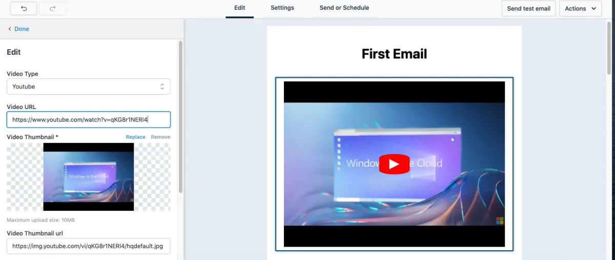 Hinweis: Aufgrund technischer Einschränkungen aller wichtigen E-Mail-Clients können wir noch keine Videos in E-Mails einbetten. Der Videoblock erstellt lediglich ein Vorschaubild (unter Verwendung des Miniaturbilds des Videos), fügt einen Wiedergabe-Button hinzu und verlinkt das Bild dann mit Ihrer Video-URL. Wenn jemand auf das Bild klickt, wird er zum Video weitergeleitet.