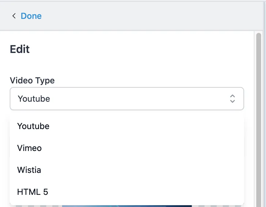 Videotyp: Derzeit gibt es 4 Optionen zur Auswahl: YouTube, Vimeo, Wistia und HTML5. Abhängig vom ausgewählten Videotyp versucht das System, das Videominiaturbild über die Video-URL abzurufen und ändert auch die Gestaltung des Wiedergabeknopfs basierend auf den Themen des Anbieters (z.B. erscheint bei YouTube der Knopf mit einem roten Hintergrund und einem weißen Wiedergabesymbol).