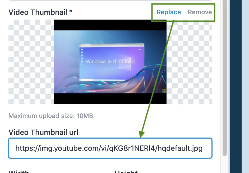 Verwenden Sie die Schaltfläche "Ersetzen", um ein benutzerdefiniertes Videominiaturbild hochzuladen und bereitzustellen