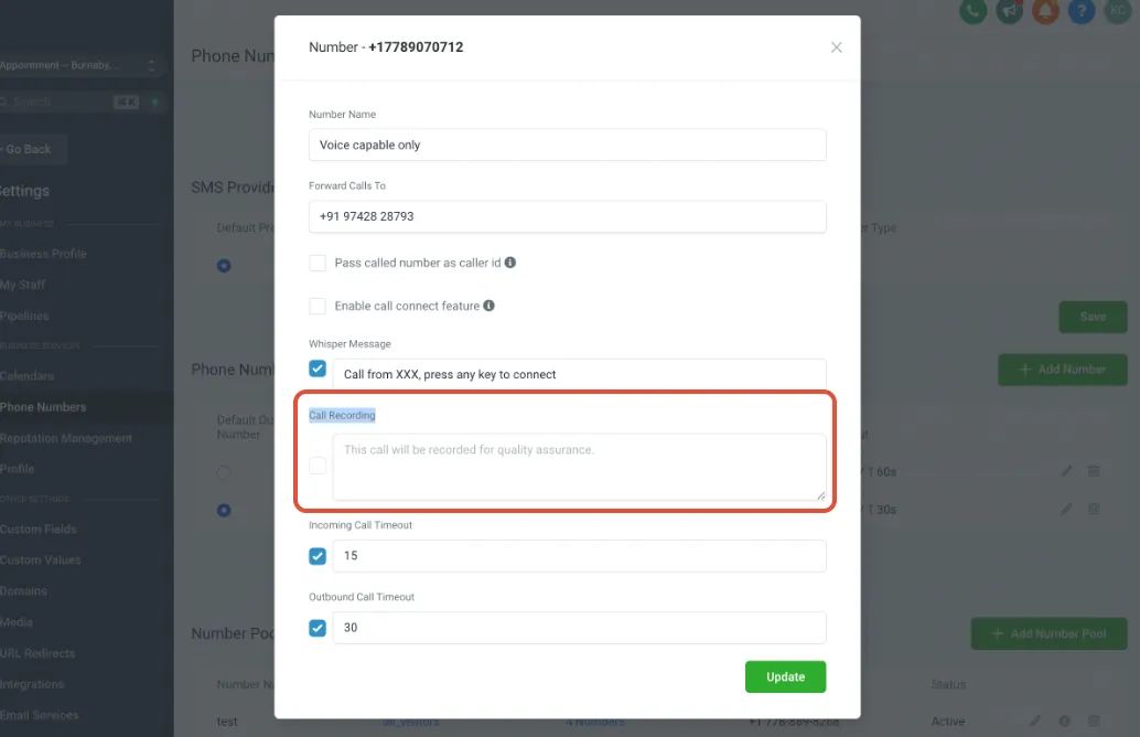 2) Sub Account > Settings > Phone Numbers > Pencil Icon for a specific phone number