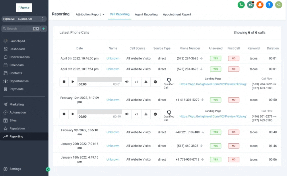Klicken Sie auf Berichterstattung > Anrufberichterstattung > Scrollen Sie nach rechts und klicken Sie auf den nach unten zeigenden Pfeil, um jeden Anruf zu erweitern