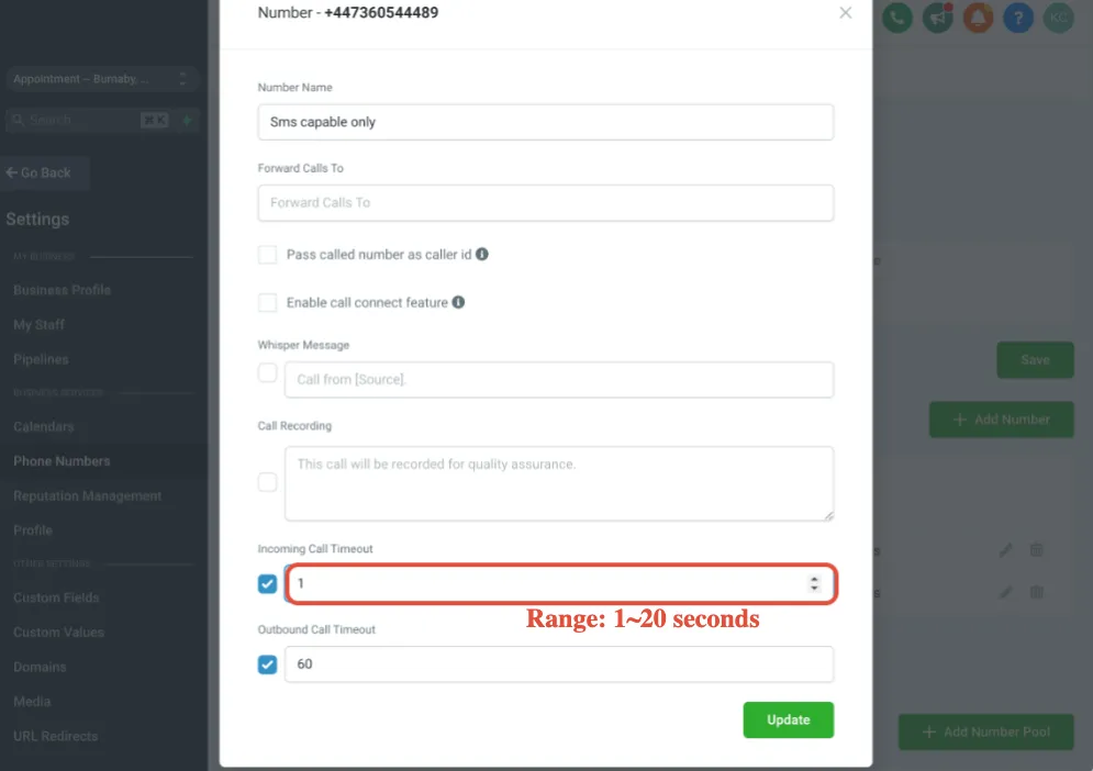 Erstens - gibt es eine Timeout-Nummer in den Benutzereinstellungen des Benutzers, zu dem diese Twilio-Nummer gehört? (Option 1 oben)Gibt es in den Telefonnummereinstellungen dieser Nummer eine Timeout-Nummer? (Option 2 oben)Dritte - Gibt es eine Timeout-Nummer in den Unternehmenseinstellungen? (Option 3 oben)
