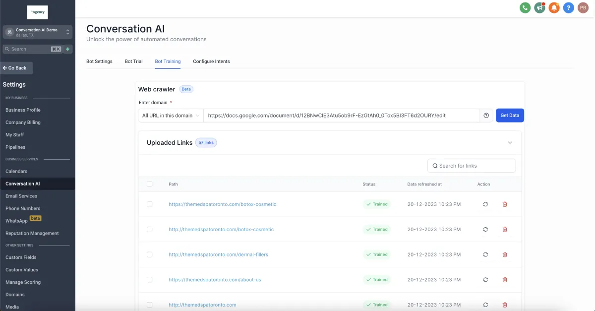 Alle Links/URLs, auf denen der Bot trainiert wurde, sind in der hochgeladenen Link-Tabelle sichtbar.Trainierte URLs können aktualisiert werden (der Bot wird mit den neuesten Informationen erneut trainiert) oder gelöscht werden (die Informationen werden aus der Wissensbasis des Bots entfernt).