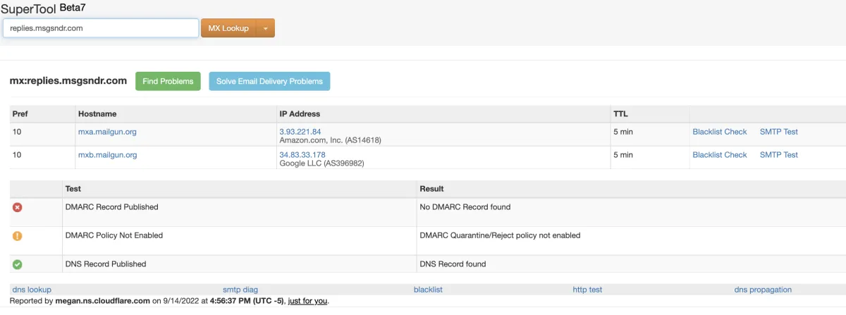 Wenn Sie mit Mxtoolbox den MX-Eintrag für die Stammdomäne suchen, verweist dieser auf Mailgun, wie im Screenshot unten gezeigt, und auf andere E-Mail-Server (z. B. Google Workspace). Wir können hier nur eines auswählen. Sie müssen also entweder eine Subdomäne für Mailgun einrichten oder die Domäne nicht für andere E-Mail-Server (z. B. Google Workspace) verwenden.