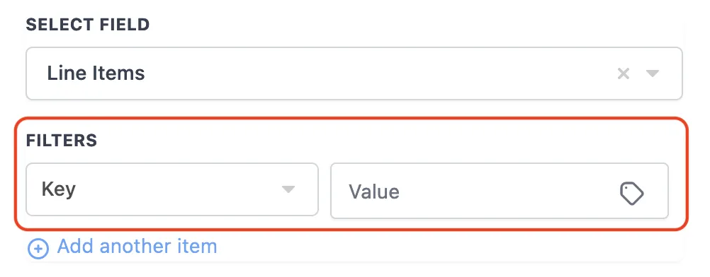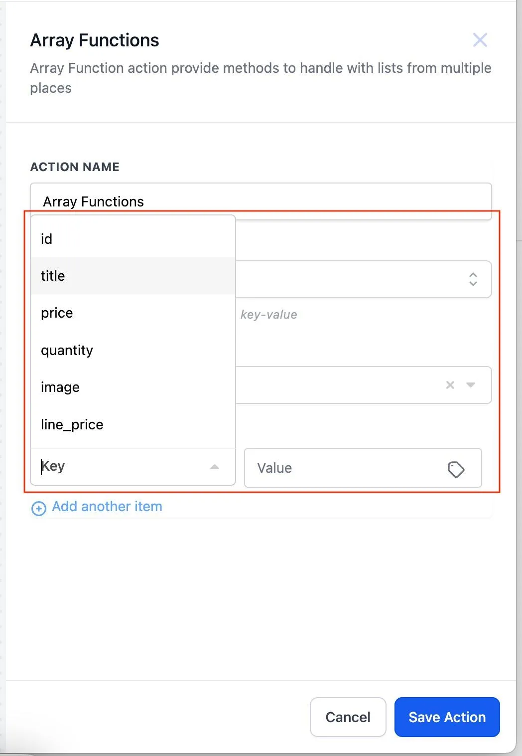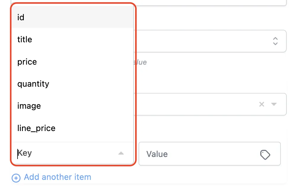 Die Liste der Schlüsselvariablen aus dem ausgewählten Array-Feld sind hier aufgeführt. In diesem Beispiel wird die Liste der Schlüsselvariablen der Shopify-Positionen aufgeführt.