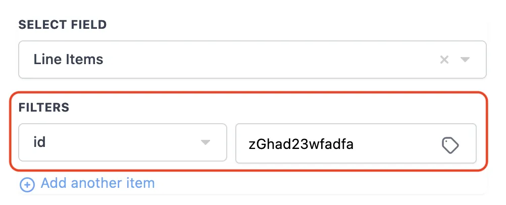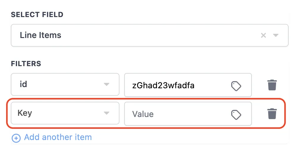 Die Liste der Schlüsselvariablen aus dem ausgewählten Array-Feld sind hier aufgelistet. In diesem Beispiel wird die Liste der Schlüsselvariablen für Shopify-Positionen aufgeführt.