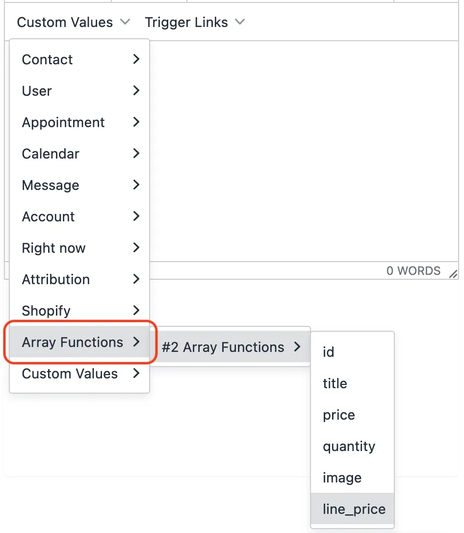 Durch das Abschließen der oben genannten Schritte können Sie nun die zurückgegebenen Objektvariablen aus der Array-Funktion als benutzerdefinierte Werte in E-Mail, SMS, If/Else usw. verwenden. Im folgenden Beispiel werden die Variablen der Shopify-Posten in den benutzerdefinierten Werten aufgelistet.