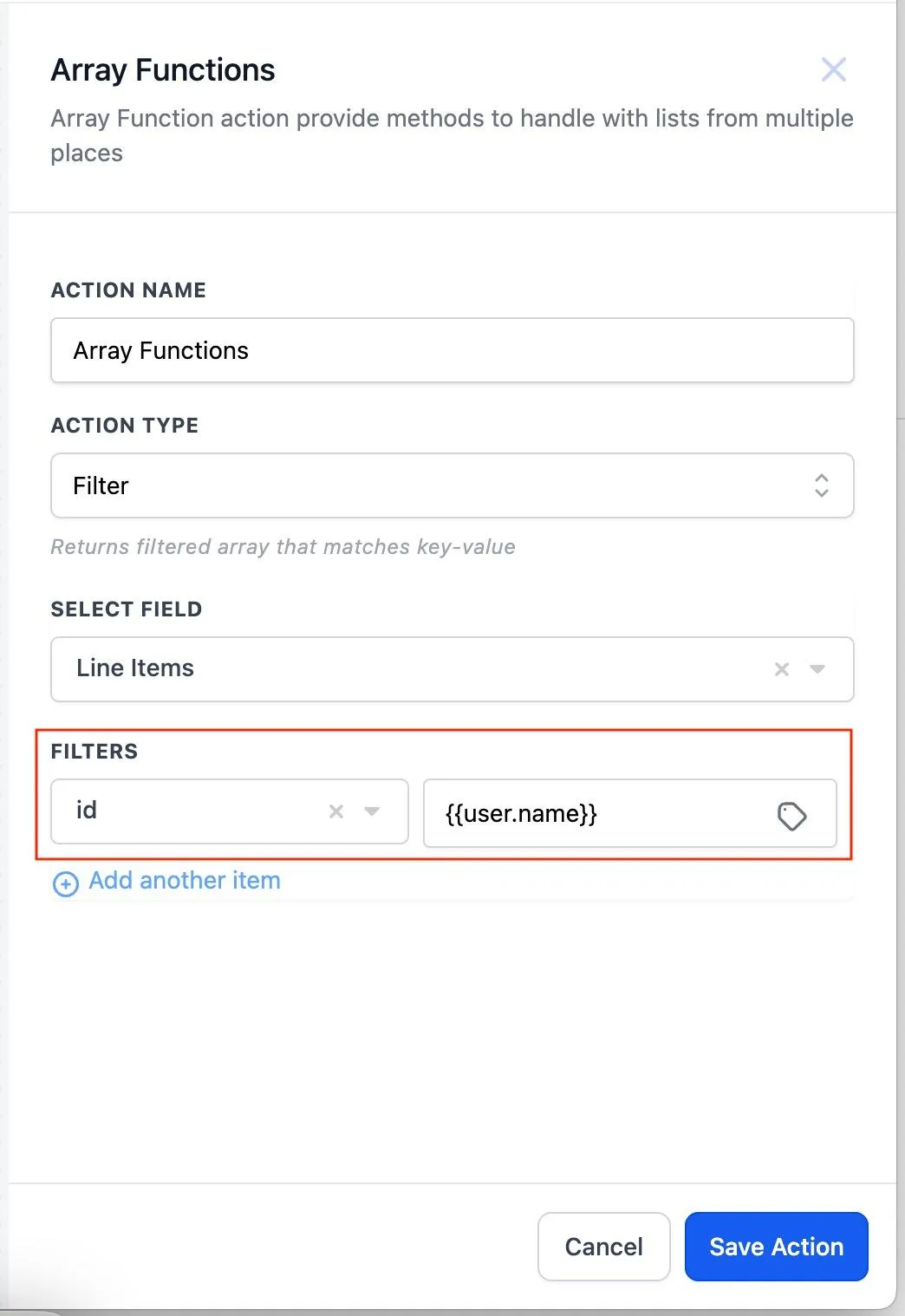 Dieser Aktionstyp hilft dabei, das Array zu filtern, indem Schlüssel-Wert-Paare in einem Array von Objekten abgeglichen werden.