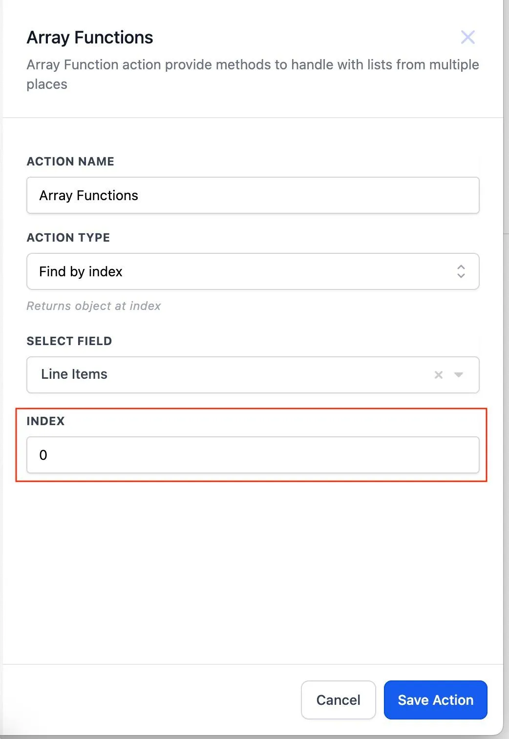 Wählen Sie den Aktionstyp "Nach Index suchen" aus dem Dropdown-Menü. Dieser Aktionstyp hilft dabei, die Indexdaten des Arrays zu finden.