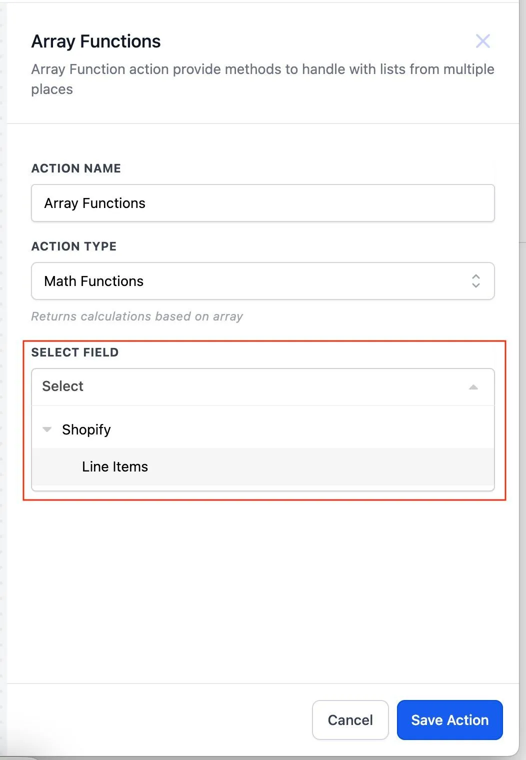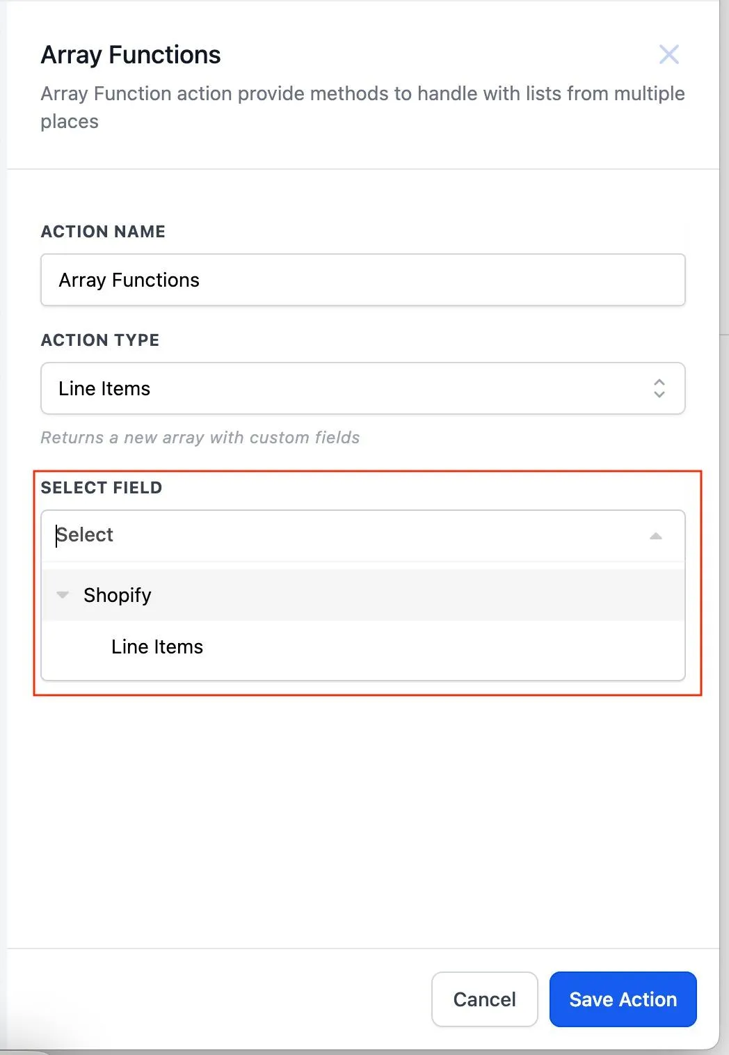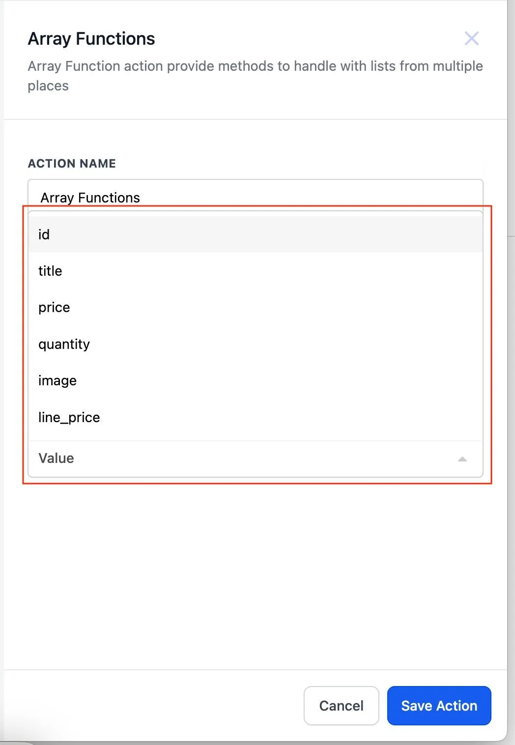 Alle Felder mit dem Datentyp Array, die im Workflow verfügbar sind, werden hier aufgelistet. Die Liste der verfügbaren Array-Daten wird aus Shopify Triggers, Inbound Webhook Trigger und Custom Webhook Action Response Daten gesammelt.